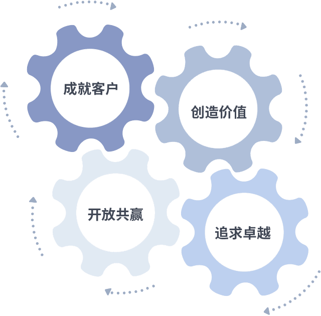 成就客户是一切决策的出发点,,,,创造价值是衡量所有工作的标准,,,,追求卓越是我们做事做人的态度,,,,开放共赢是我们的格局也是最终的结果。。。。价值观的齿轮环环相扣,,,推动着组织里的每个人不断向前。。。