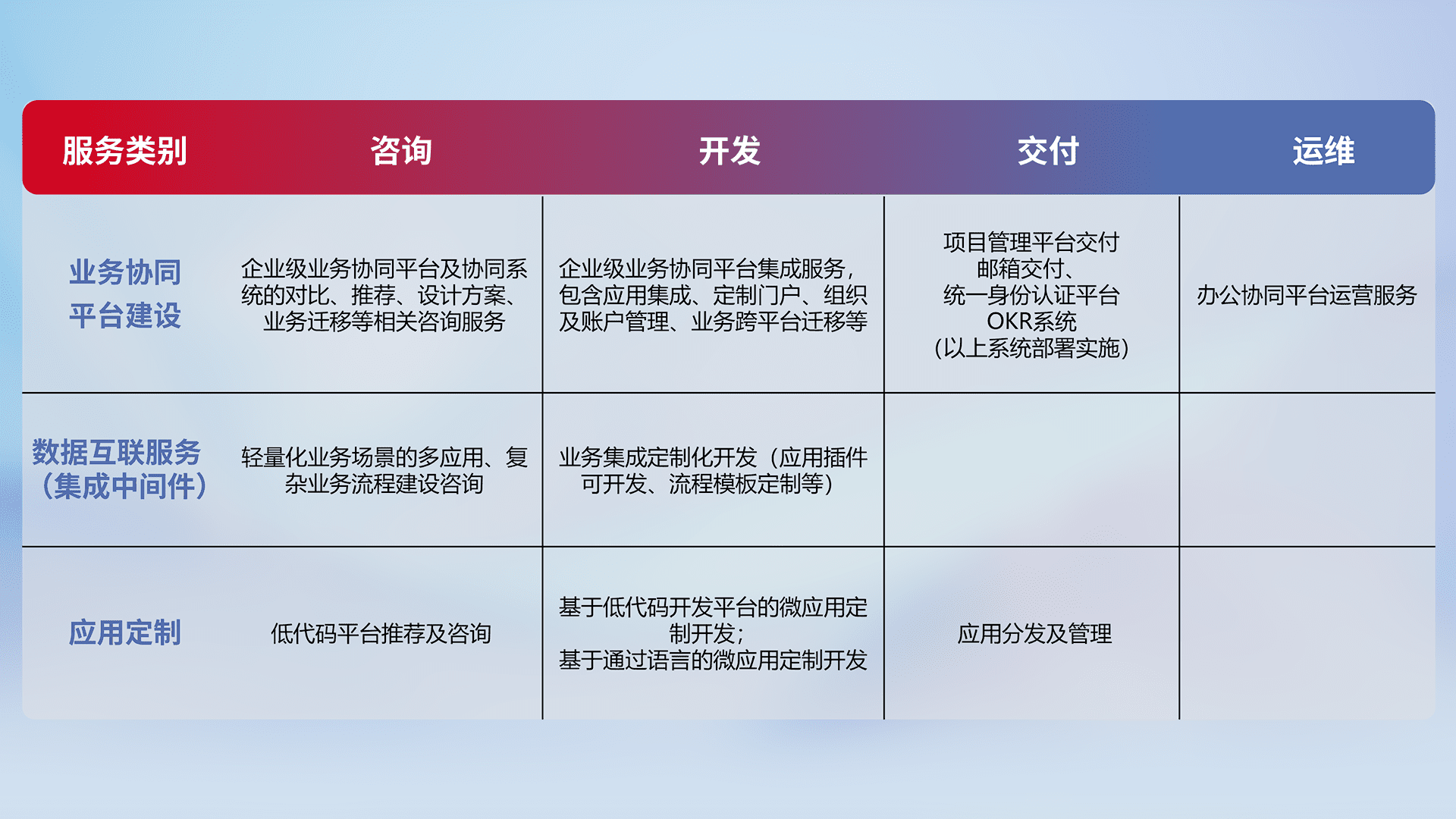 针对钉钉、、企微、、、IDaas等平台级产品提供产品的规划、、、、方案、、、交付、、、、定制化开发等服务,,实现如统一协同办公、、、、智能客户服务、、混合会议管理、、、智能数据查询、、、等业务场景,,,,实现数字化转型。。